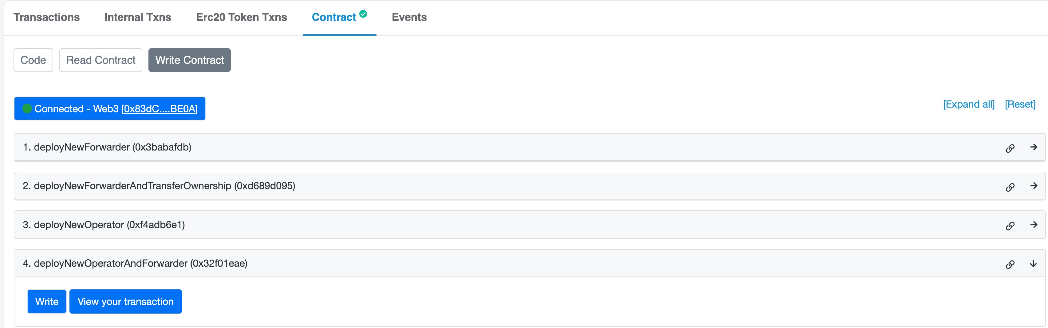 4. Click the deployNewOperatorAndForwarder function to expand it and then click the Write button to run the function. Metamask prompts you to confirm the transaction.
